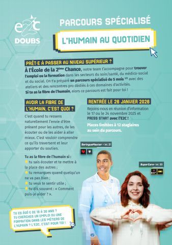 Destiné aux jeunes de 18 à 30 ans peu ou non qualifiés, le parcours spécialisé de l’E2C25 accompagne celles et ceux qui souhaitent construire un projet professionnel dans les métiers de l’humain, de l’accompagnement et du soin.